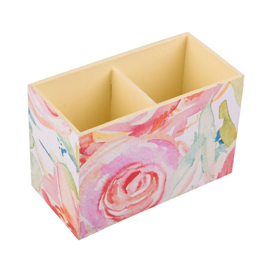 A Tiny Mistake Yellow and Pink Pastel Floral Finish Wooden Cutlery Holder, 15 x 8 x 10 cm