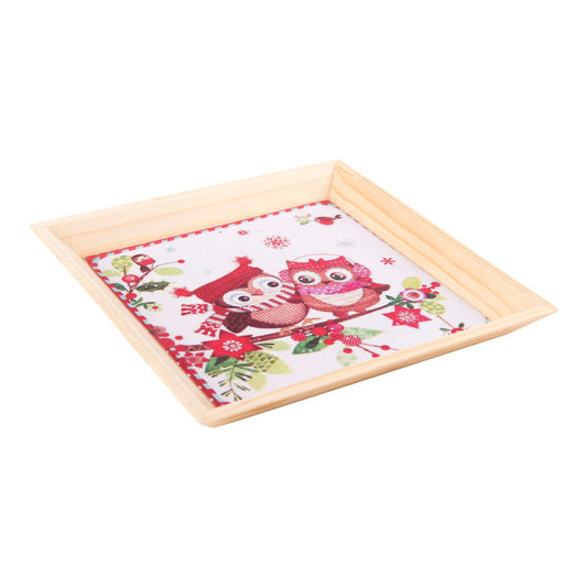 A Tiny Mistake Cute Couple Owls celebrating Christmas Small Square Wooden Serving Tray, 18 x 18 x 2 cm