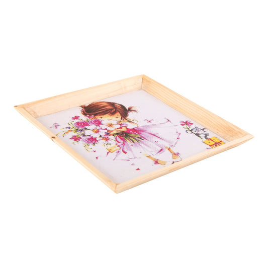 A Tiny Mistake Little Girl with Flower Bouquet Small Square Wooden Serving Tray, 18 x 18 x 2 cm