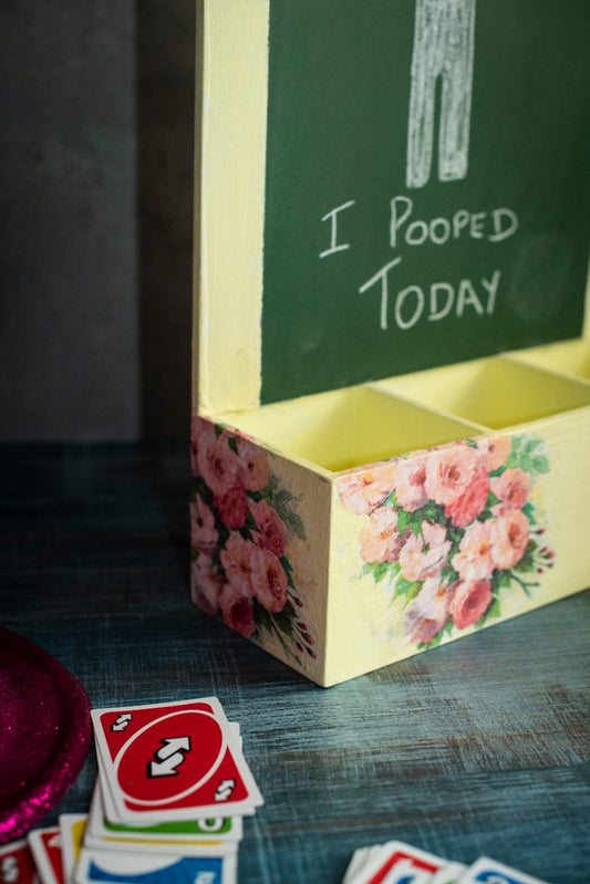 A Tiny Mistake Yellow Floral Wooden Stationery Organiser with Whiteboard, Store your Pens, Stationery, Accessories, Sticky Notes all in one place, Can be hung also