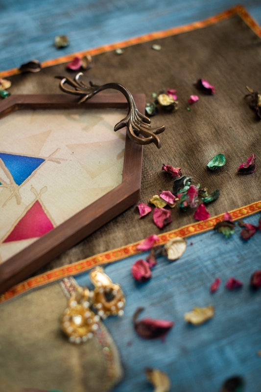 A Tiny Mistake Hand Block Printed Golden Peacock Hexagon (Set of 2) Teak Serving Trays with Brass Handle, Tray for Serving Tea and Snacks, Centerpiece