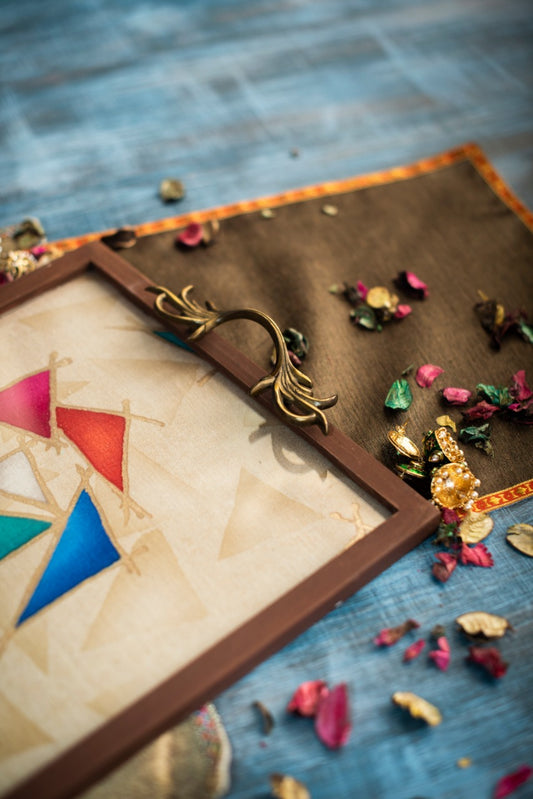 A Tiny Mistake Block Print Triangles Square Teak Tray withh Brass Handle Serving Tray