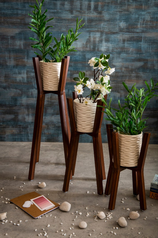 A Tiny Mistake Three Part Wooden Planter Stand Dark Finish with White Ceramic Pots