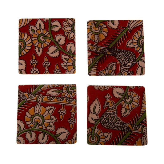A Tiny Mistake Red and Green Floral Fabric Square Wooden Coasters (Set of 4), 9.5 x 9.5 x 0.5 cm