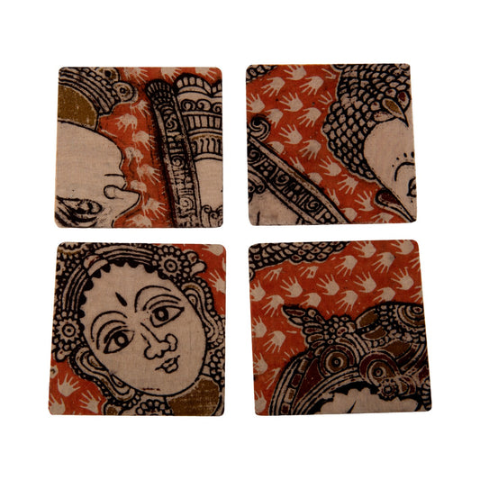 A Tiny Mistake Orange Kalamkari Faces Fabric Square Wooden Coasters (Set of 4), 9.5 x 9.5 x 0.5 cm