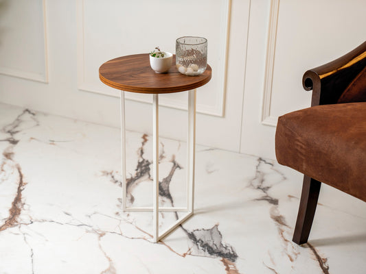 Teak Hues (Ivory Legs) Round Oblique Side Tables, Wooden Tables, Living Room Decor by A Tiny Mistake