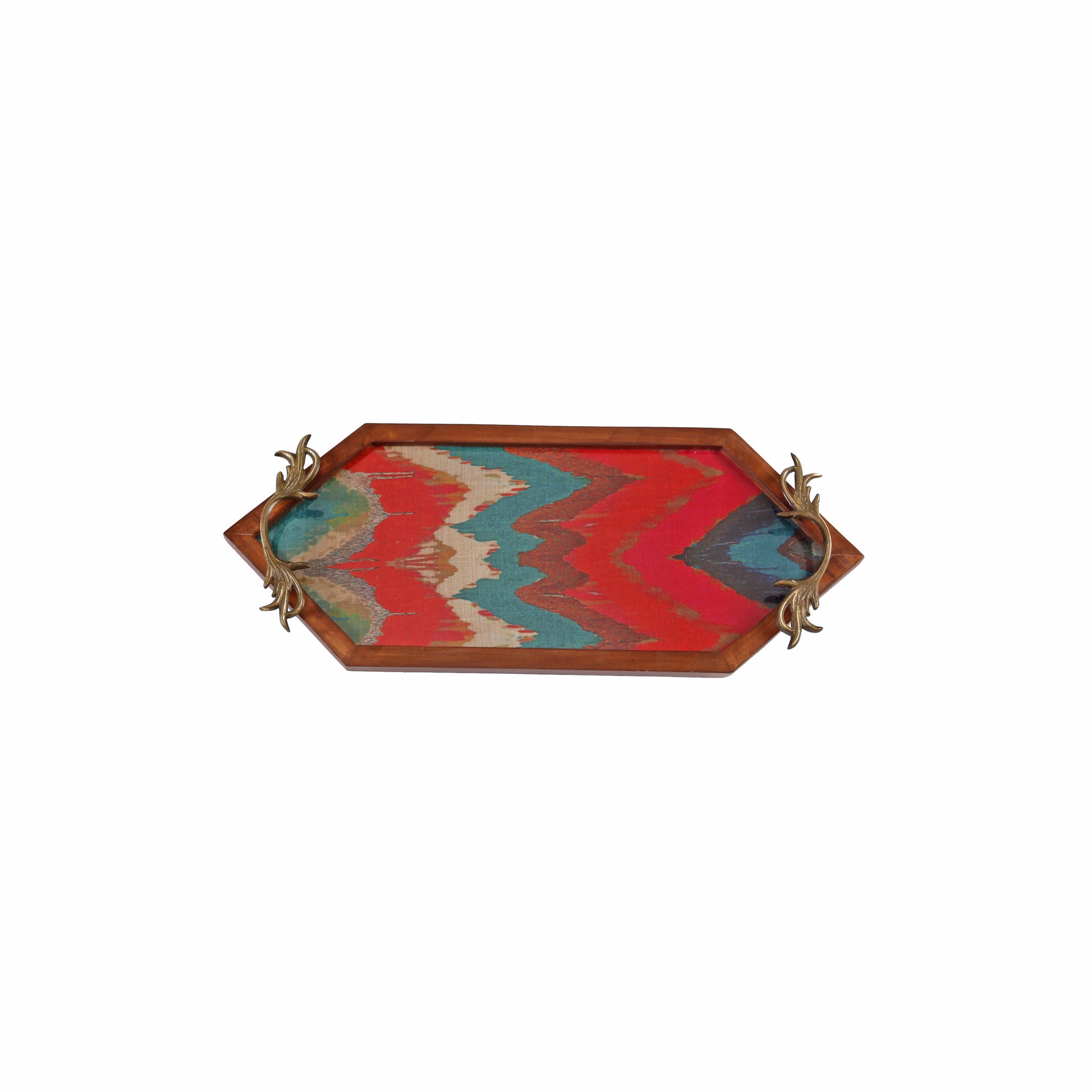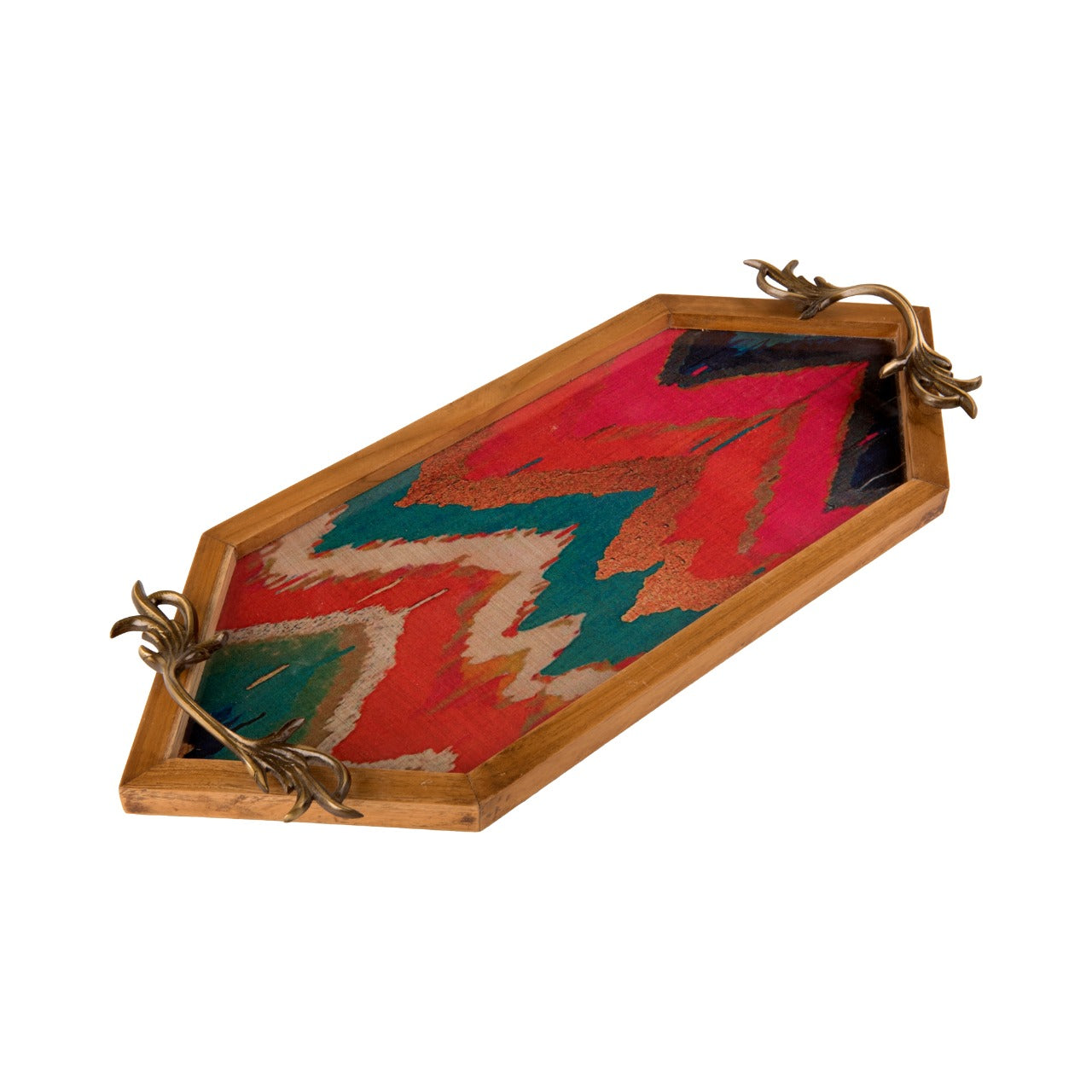 A Tiny Mistake Vibrant Ikat Print Diamond Shaped Teak Serving Tray with Brass Handle, Tray for Serving Tea and Snacks, 49 x 20 x 2 cm
