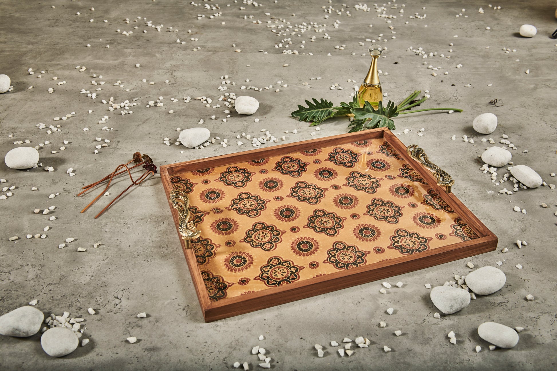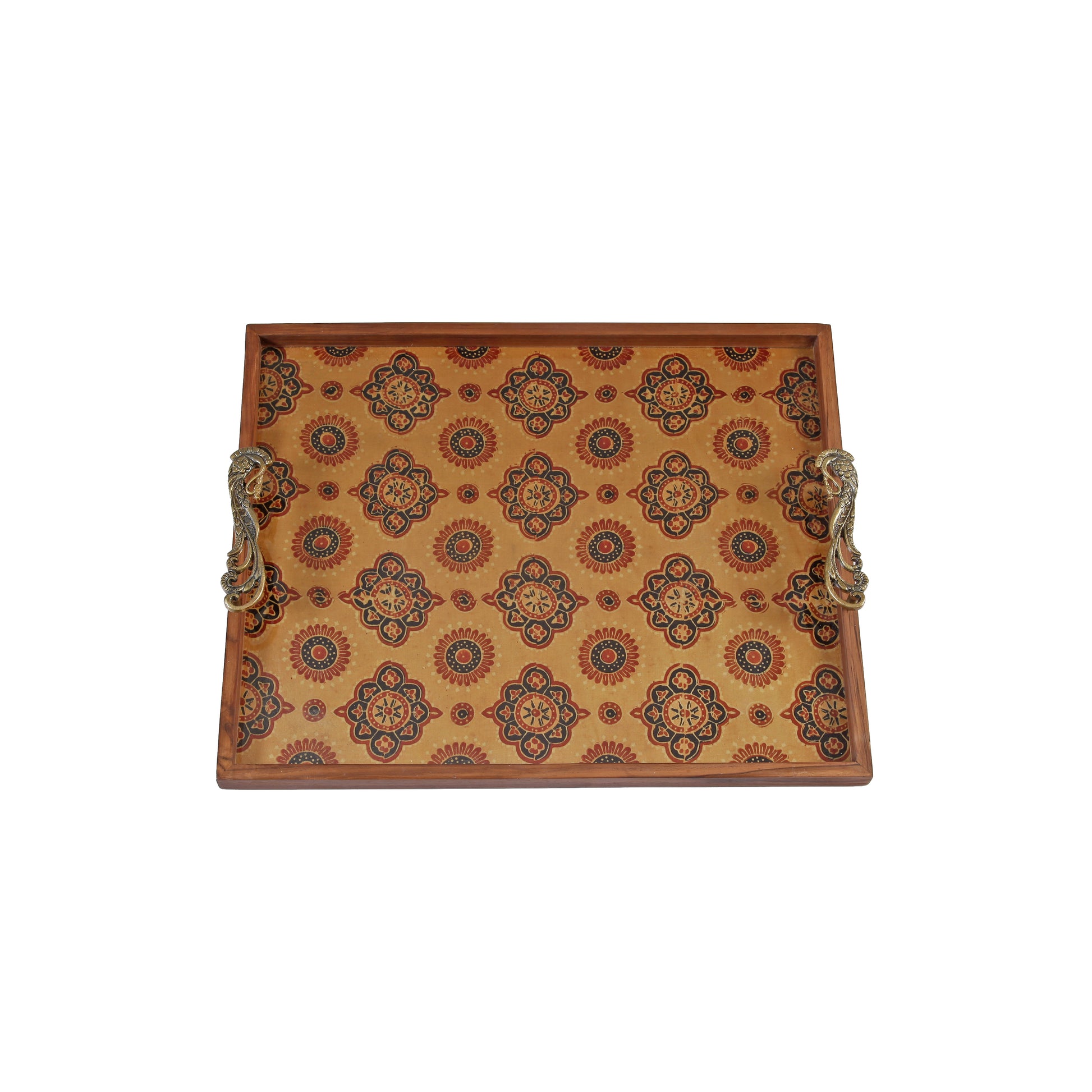 A Tiny Mistake Golden Motifs On Yellow Base Teak Tray with Brass Handle Big Serving Tray