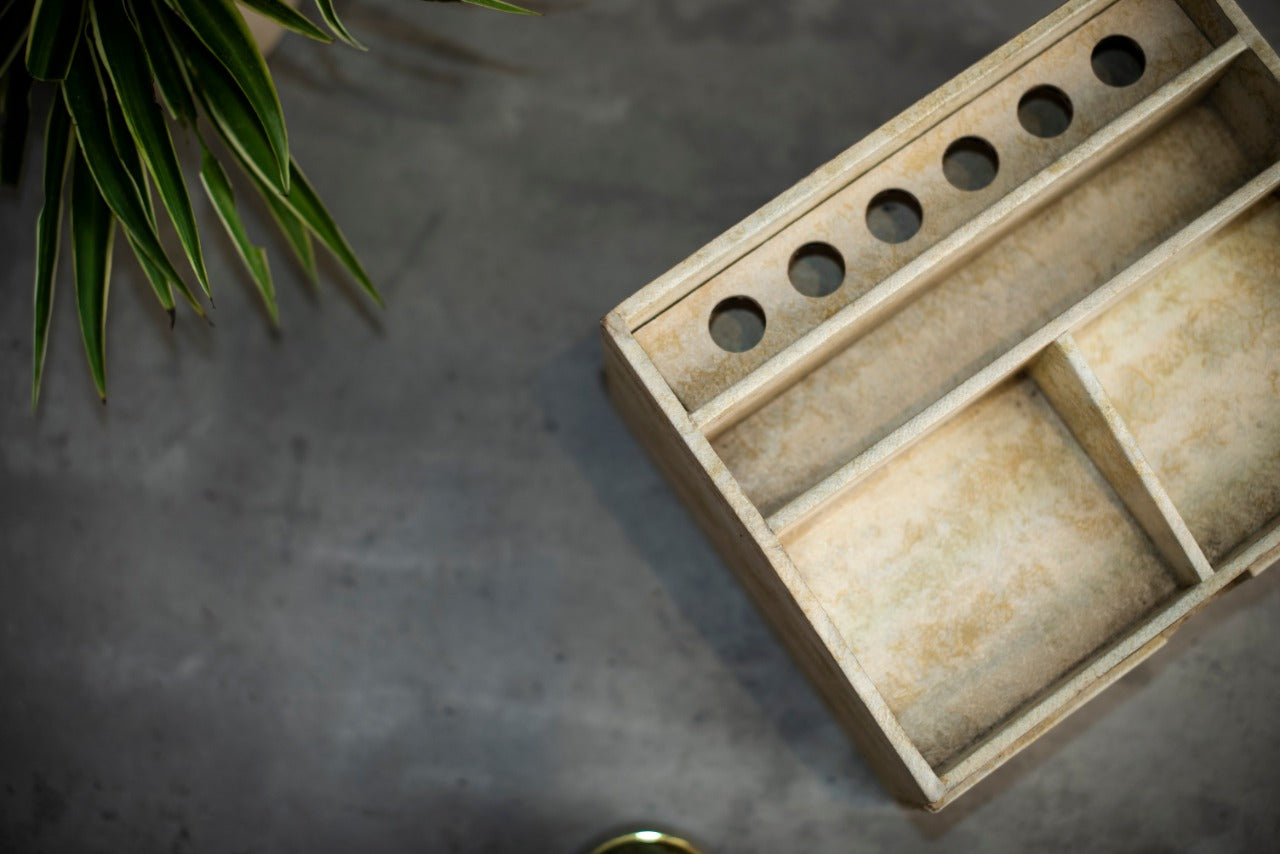 MADE IN INDIA: This make up organiser curated by A Tiny Mistake looks lovely kept on your dresser housing all your tiny knick knacks and your make up. Having two shallow drawers accompanied by open partitions on the top, this helps you organise your lipsticks, eye make up, nail paint, etc, and doesn't even take up a lot of space. All in all, the perfect gift for the ardent make up lover ! Our team of artisans handcraft these products with a lot of love in our workshop. We design and manufacture our product range in India.