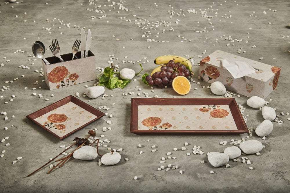 MATERIAL CARE: Made using Pine Wood, these trays are lightweight and very handy to use. Perfect for serving water, tea & coffee, these trays are good for everyday use.These trays can be cleaned by wiping with a damp cloth. They will repel water but cannot be washed under running water or with soap.