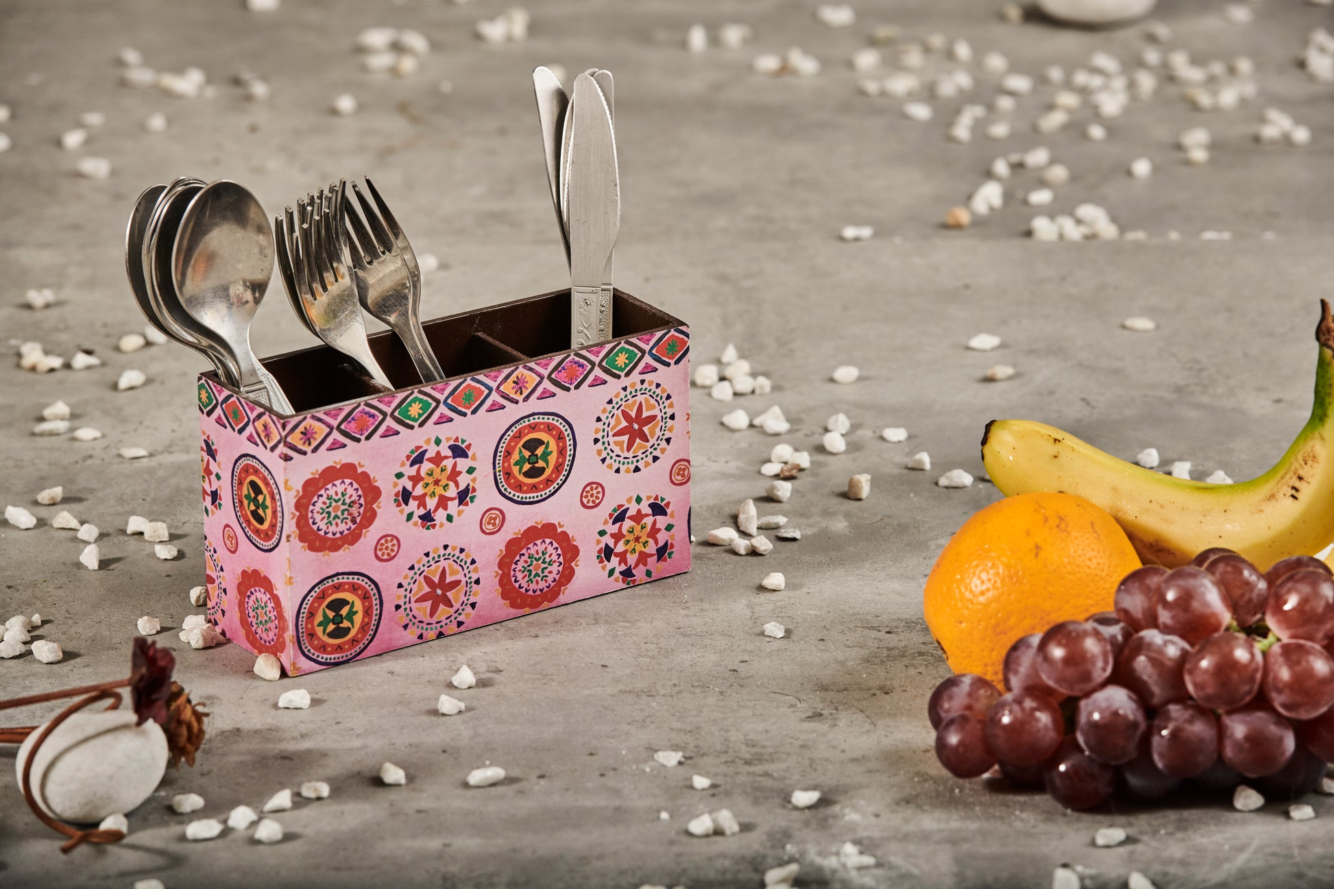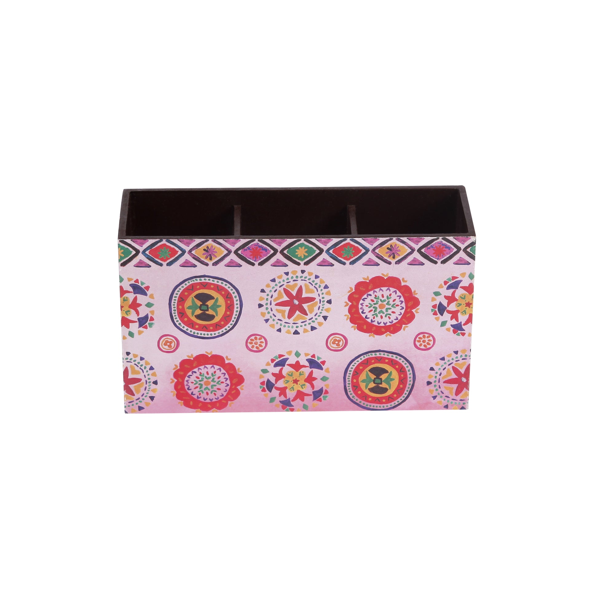 MADE IN INDIA: This partitioned cutlery holder is a delight to use. With two partitions to keep your cutlery and made using MDF, the colourful patterns simply light up the table where they are put. Our team of artisans handcraft these products with a lot of love in our workshop. We design and manufacture our product range in India.