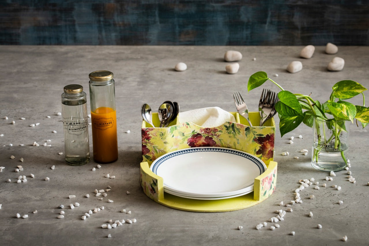 A Tiny Mistake Red Flowers and Pale Yellow Wooden Finish Buffet Organiser, Organise your plates and cutlery, Serveware, Dining Organisation