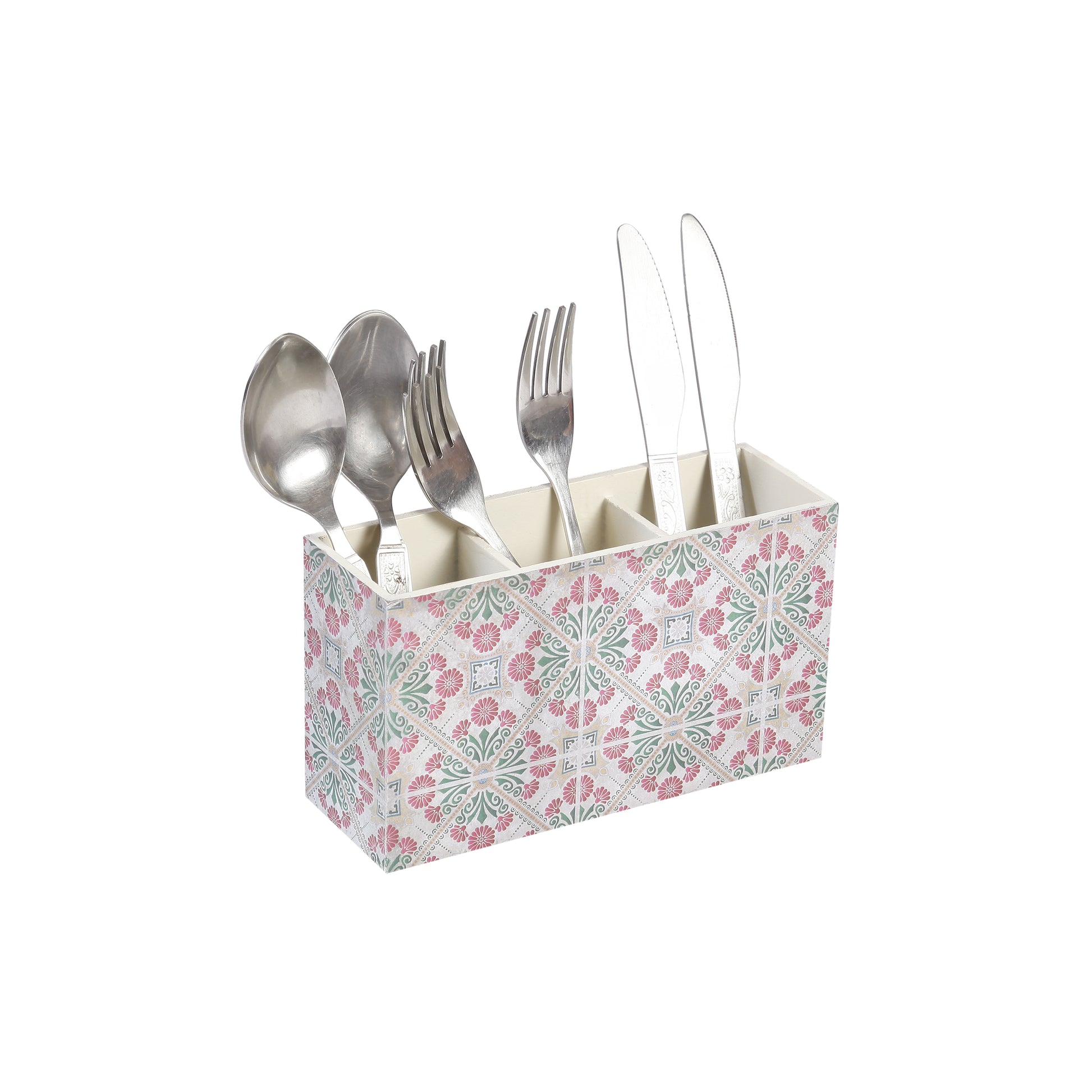 MADE IN INDIA: This partitioned cutlery holder is a delight to use. With two partitions to keep your cutlery and made using MDF, the colourful patterns simply light up the table where they are put. Our team of artisans handcraft these products with a lot of love in our workshop. We design and manufacture our product range in India.