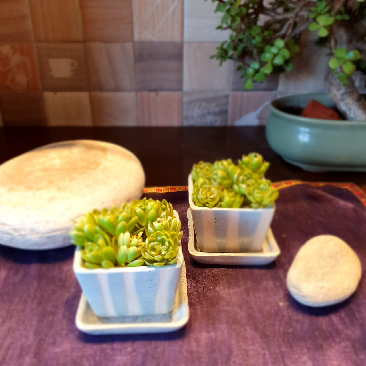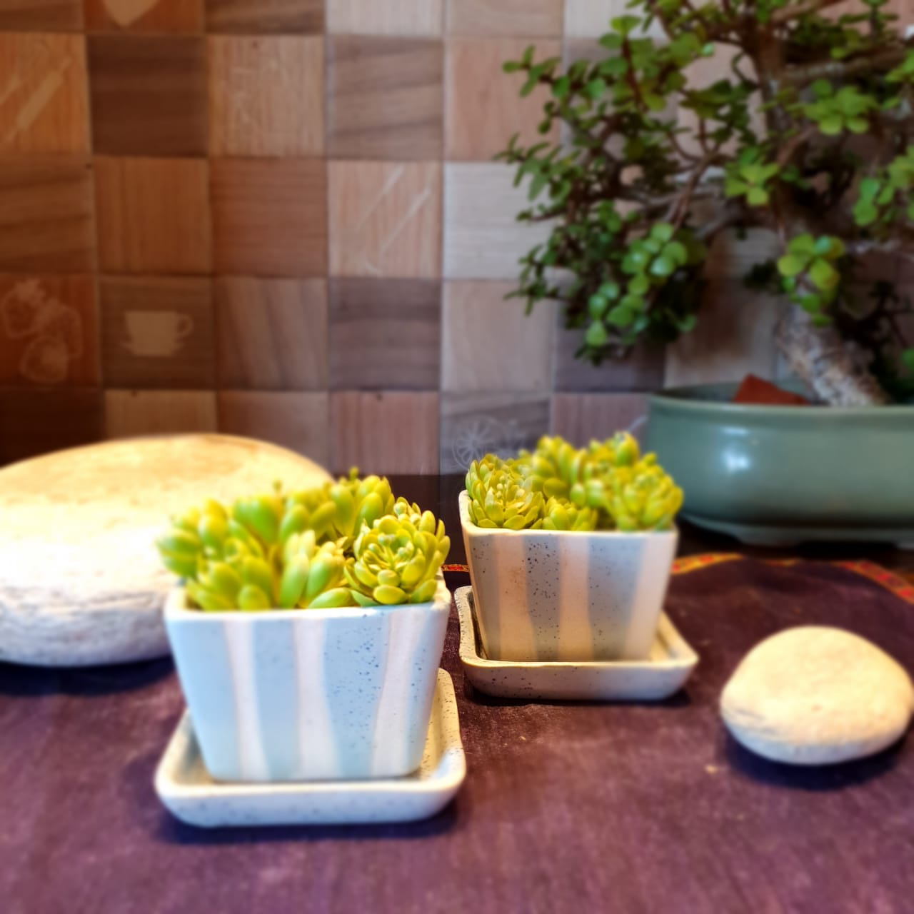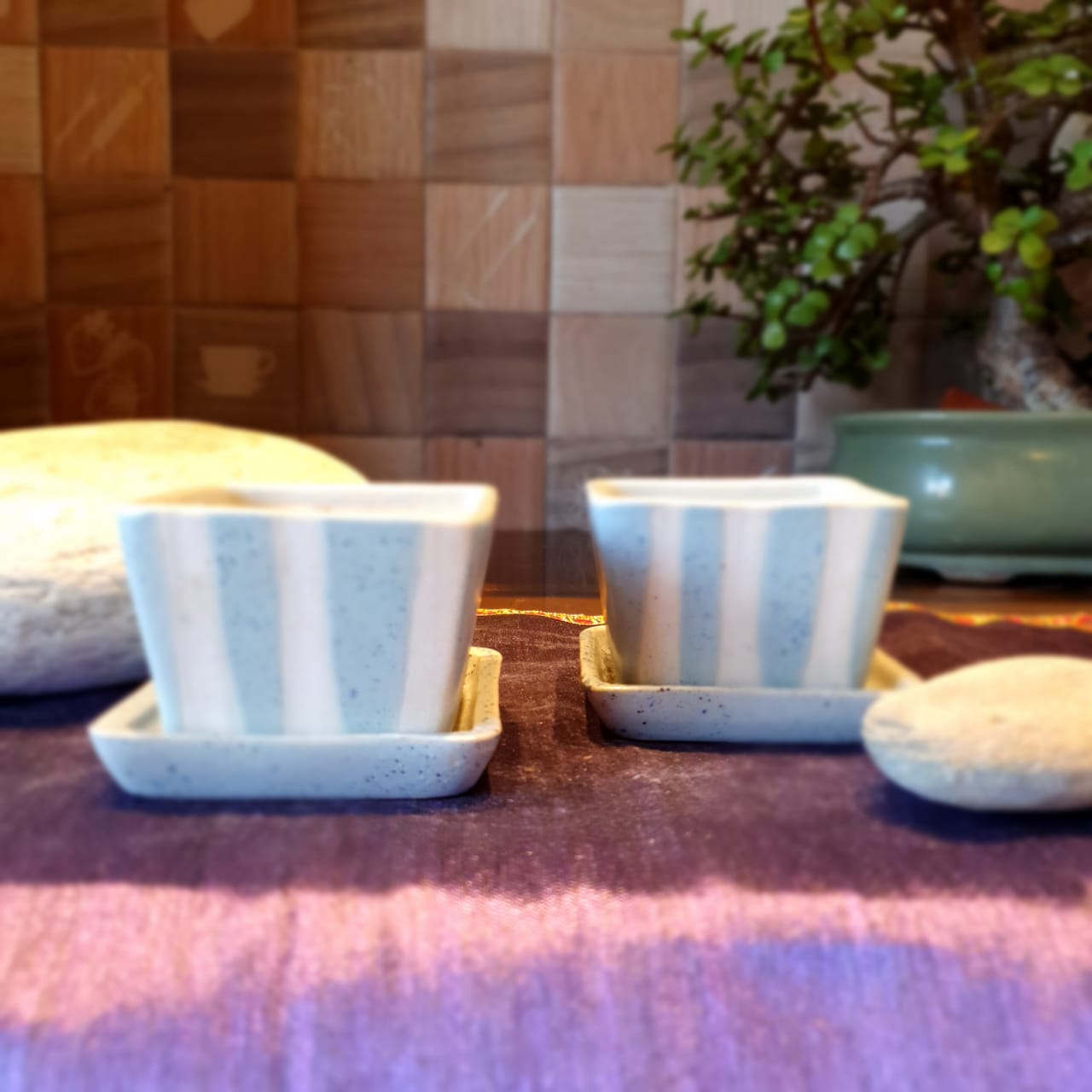 Pastel Coloured and White Coloured Stripes Square Shape Planter with Plate (Set of 2), Outdoor and Indoor Planter, Ceramic Planter for Real Plants (Blue and White)