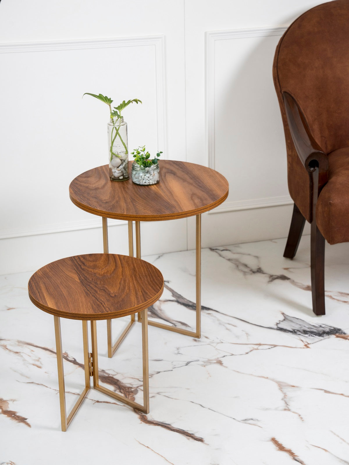 Teak Hues Round Oblique Nesting Tables, Side Tables, Wooden Tables, Living Room Decor by A Tiny Mistake